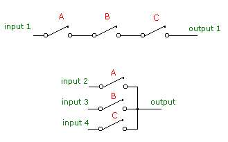 In the first set of switches A, B, and C they are arranged in "series" so that for the input to reach the output all the switches must be closed. This may be considered an "AND-GATE".